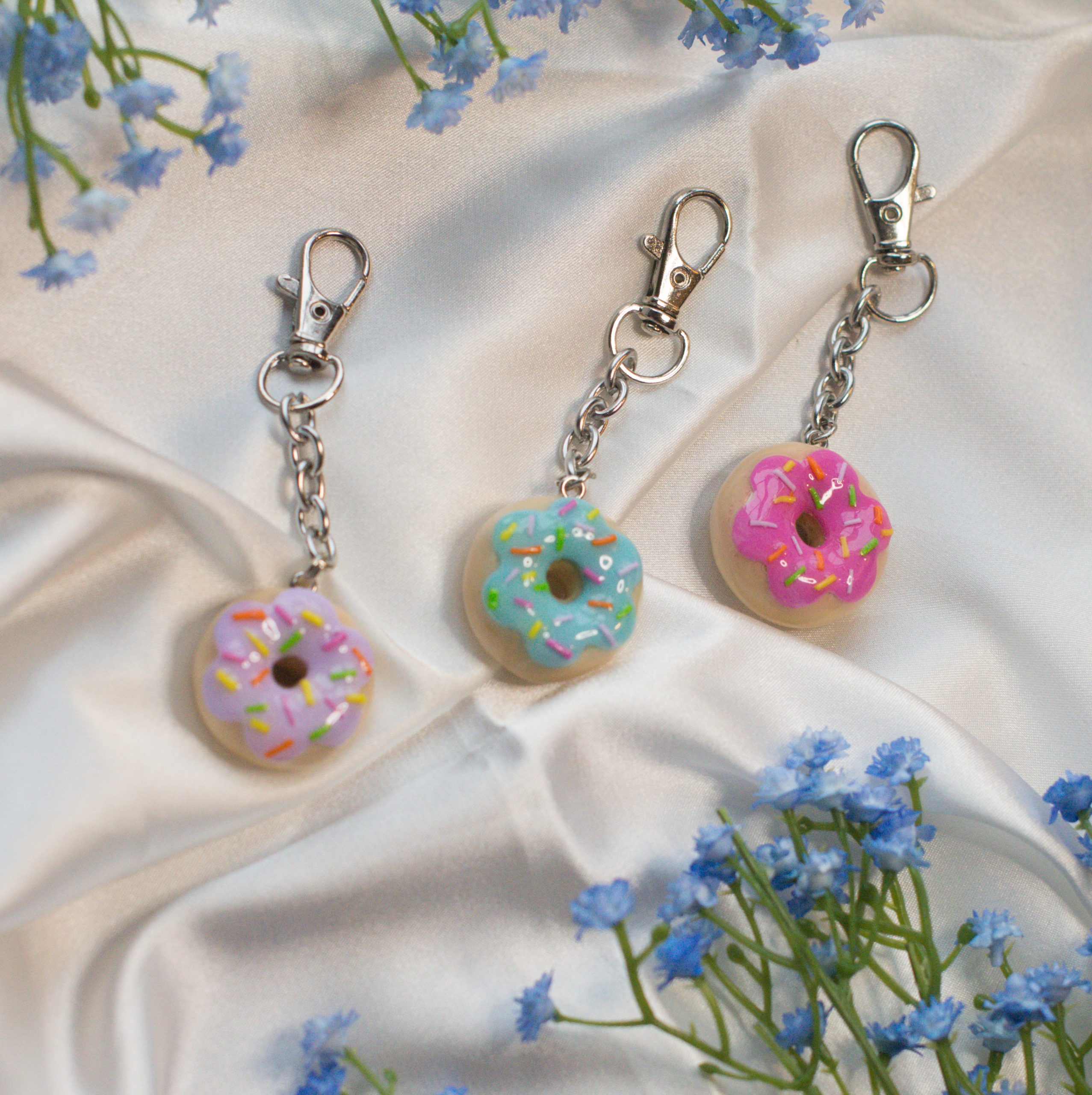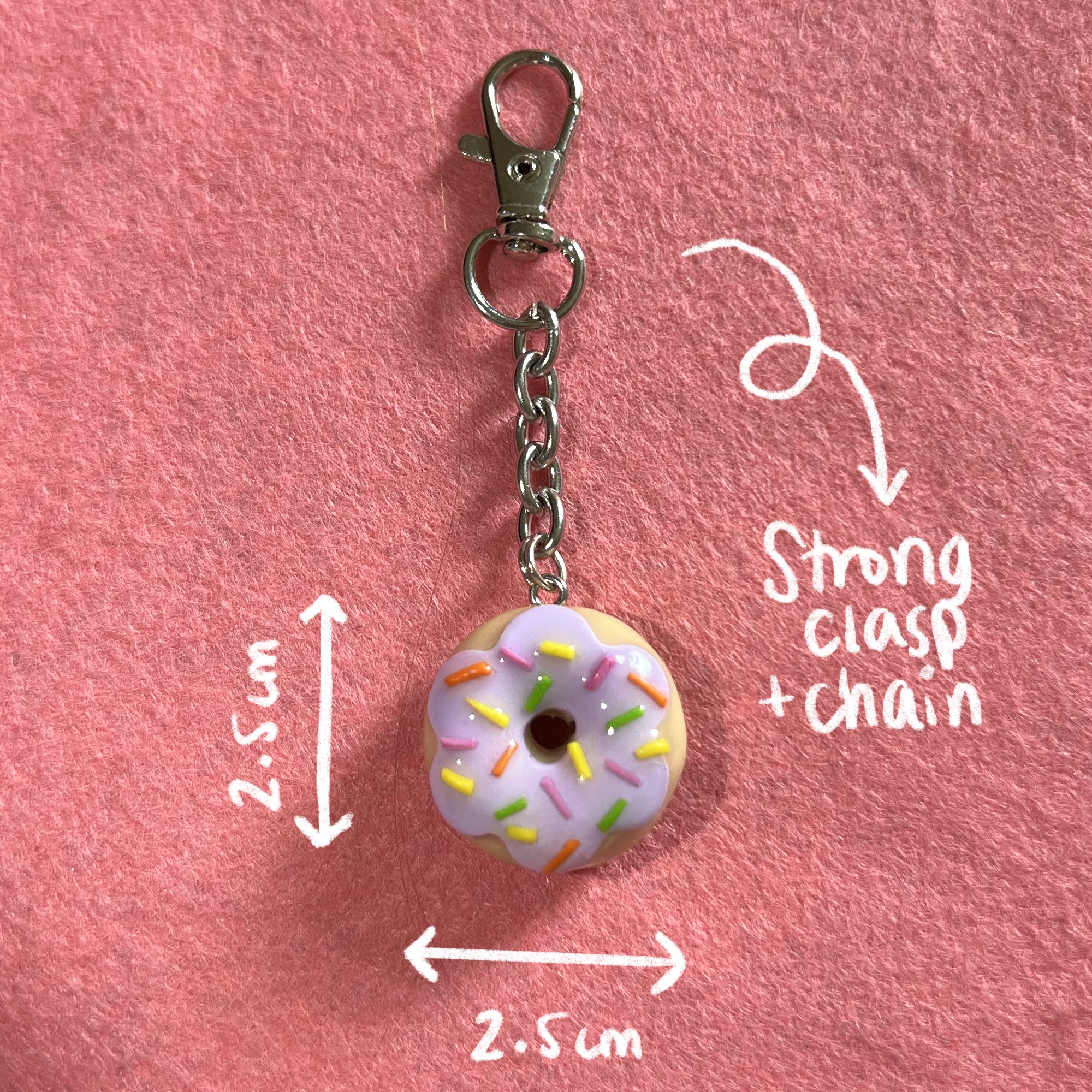 Gorgeously cute pastel pink/lilac/blue donut keyring perfect for decorating your keys or bag! Glazed with UV resin to provide extra protection for general knocks and bumps and supplied with a strong lanyard clasp as shown in the photos.