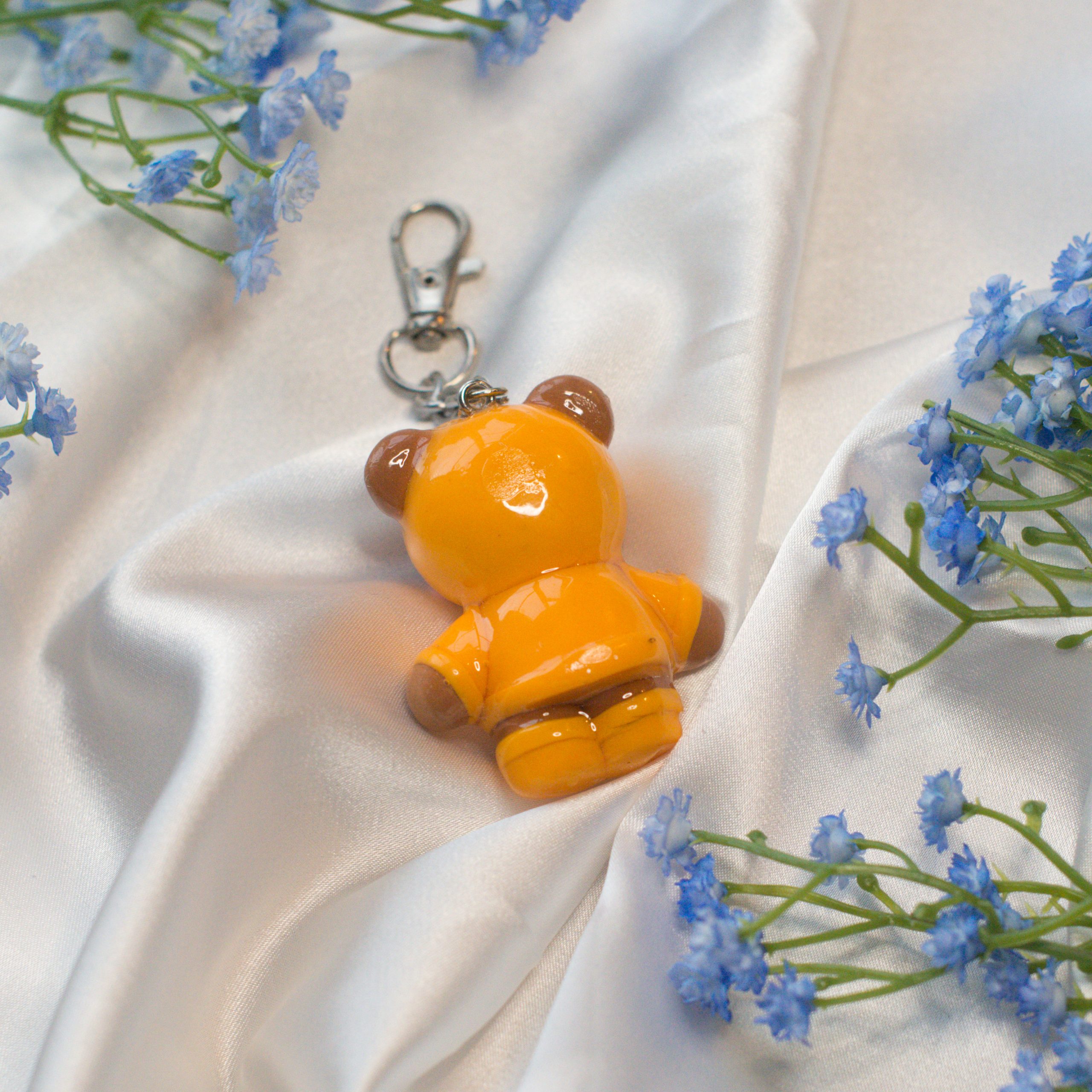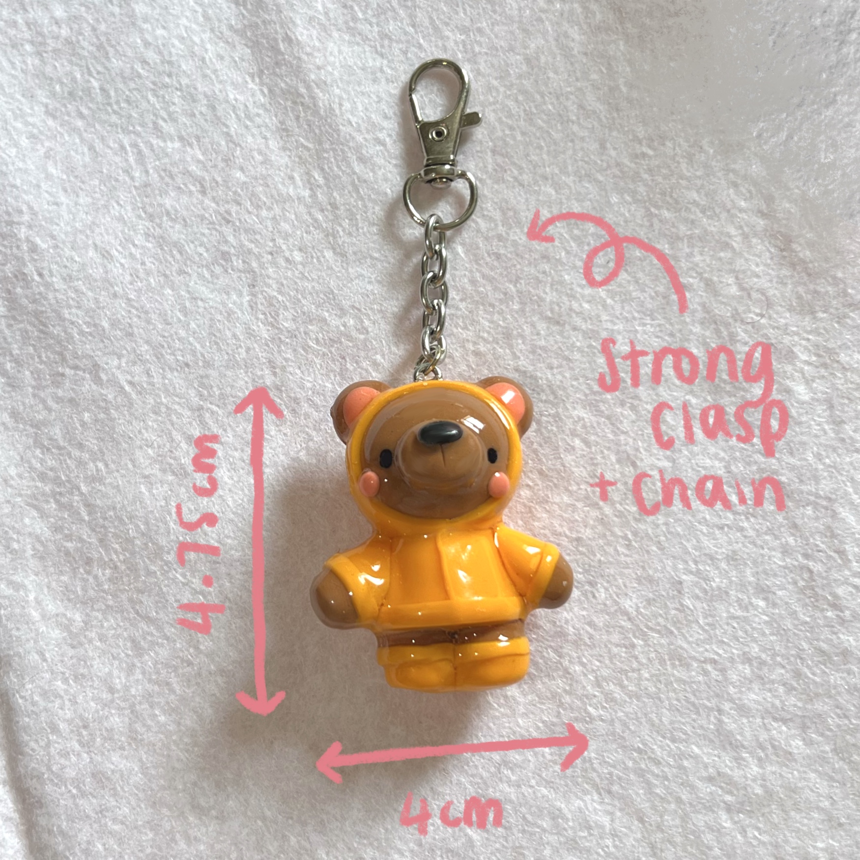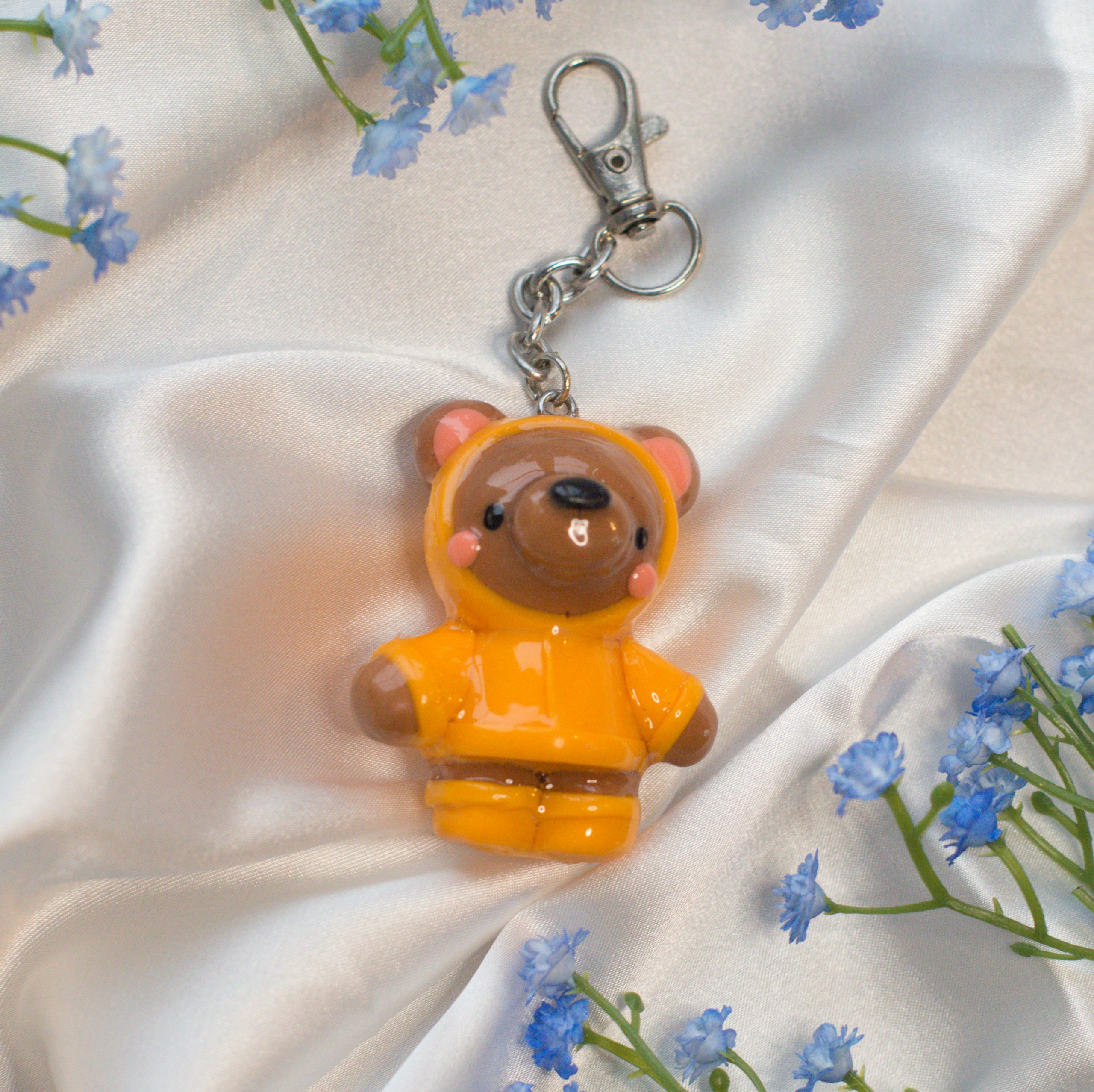 Lovely raincoat teddy keyring perfect for decorating your keys or bag! Glazed with UV resin to provide extra protection for general knocks and bumps and supplied with a strong lanyard clasp as shown in the photos.